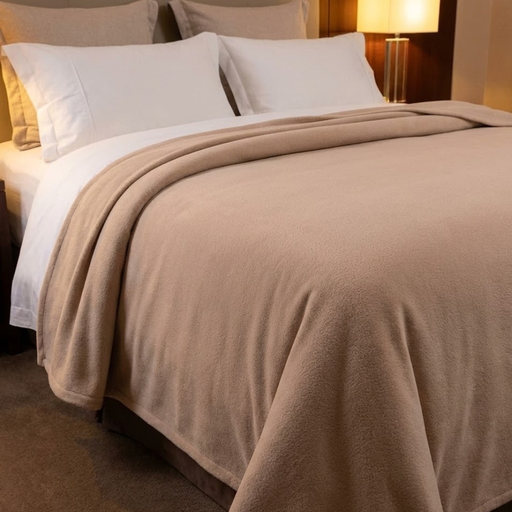 Eleve el estándar de sus habitaciones con la Frazada Polar Aspen de Vacanza en color Camel. Diseñada específicamente para la exigencia hotelera, esta prenda es un 25% más grande y pesada que las frazadas tradicionales, garantizando mayor abrigo y una caída impecable en la cama. Su tejido de alta densidad cuenta con tratamiento anti-peeling (no forma pelotitas) y está optimizado para resistir lavados frecuentes sin perder suavidad ni color. Disponible para confección en todas las medidas de cama. Calidad espectacular garantizada por Casa Santiago.